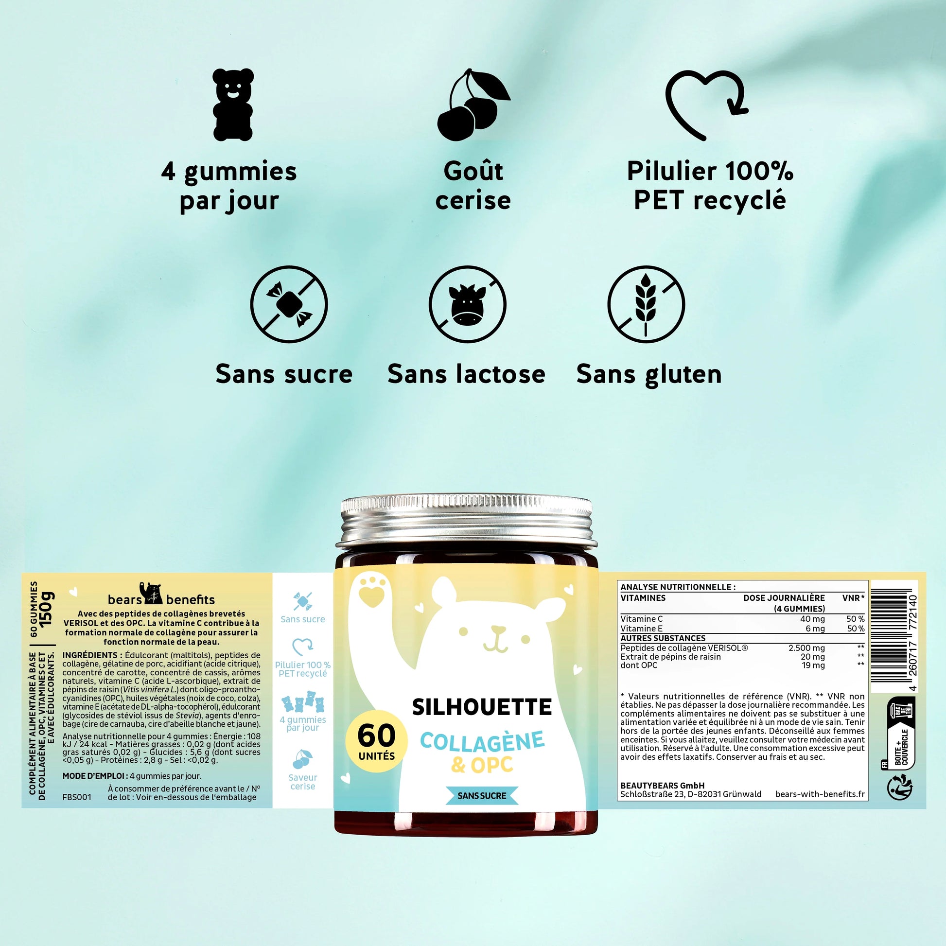 2. Silhouette - avec du collagène, OPC pour une peau raffermie, sans sucre: Découvrez notre produit "Silhouette", un complément alimentaire spécialement développé pour soutenir le raffermissement de la peau. Avec un mélange de collagène, OPC et vitamines C et E, ce produit riche en antioxydants va contribuer à agir positivement sur votre silhouette.