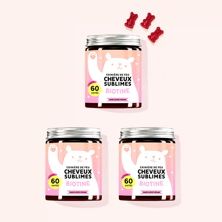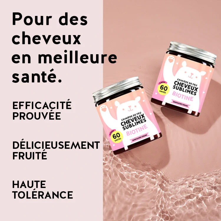 Envie de cheveux forts et brillants, d'une peau éclatante et d'ongles résistants ? Nos gummies, riches en vitamines, sont la solution idéale pour maintenir vos cheveux, votre peau et vos ongles en pleine forme. Pourquoi choisir "Cheveux sublimes" avec de la biotine ?