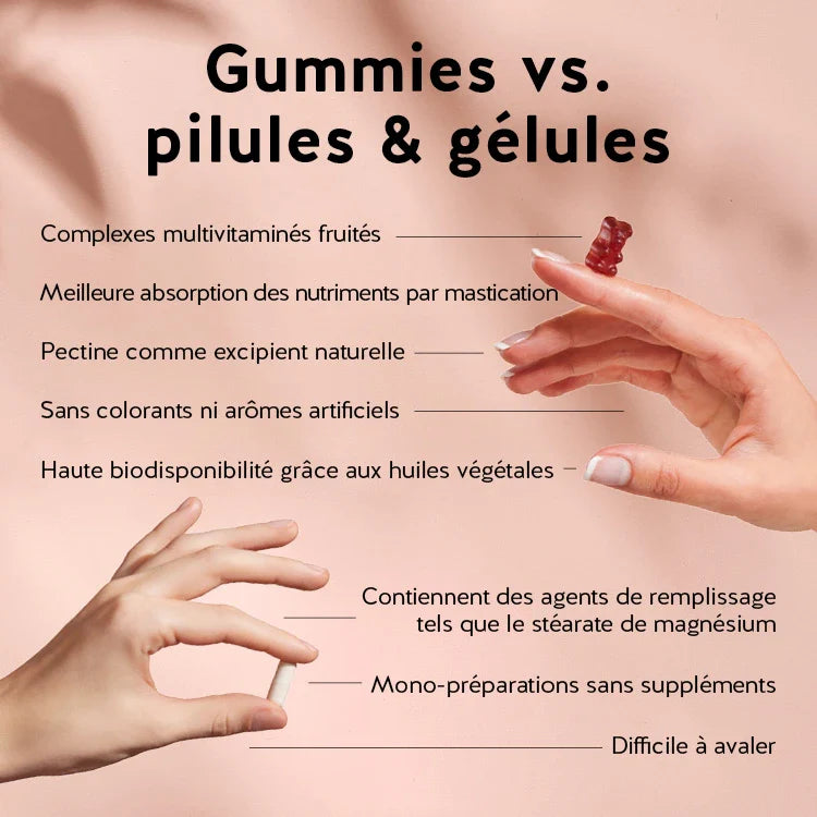 Nos gummies « Cheveux sublimes » sont vegan, sans sucre et utilisent des arômes naturels (framboise, baies sauvages) pour une expérience gourmande et naturelle.