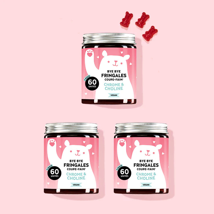 Vous connaissez cette sensation de faim et l'envie soudaine de grignoter ? Que ce soit le soir sur le canapé ou pendant le travail, les gummies Bye Bye Fringales Coupe-Faim, enrichis en chrome et en choline, un micronutriment essentiel, ont été spécialement développés pour vous aider à maintenir une glycémie normale et à couper la faim naturellement.