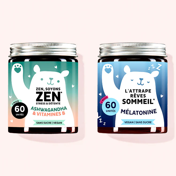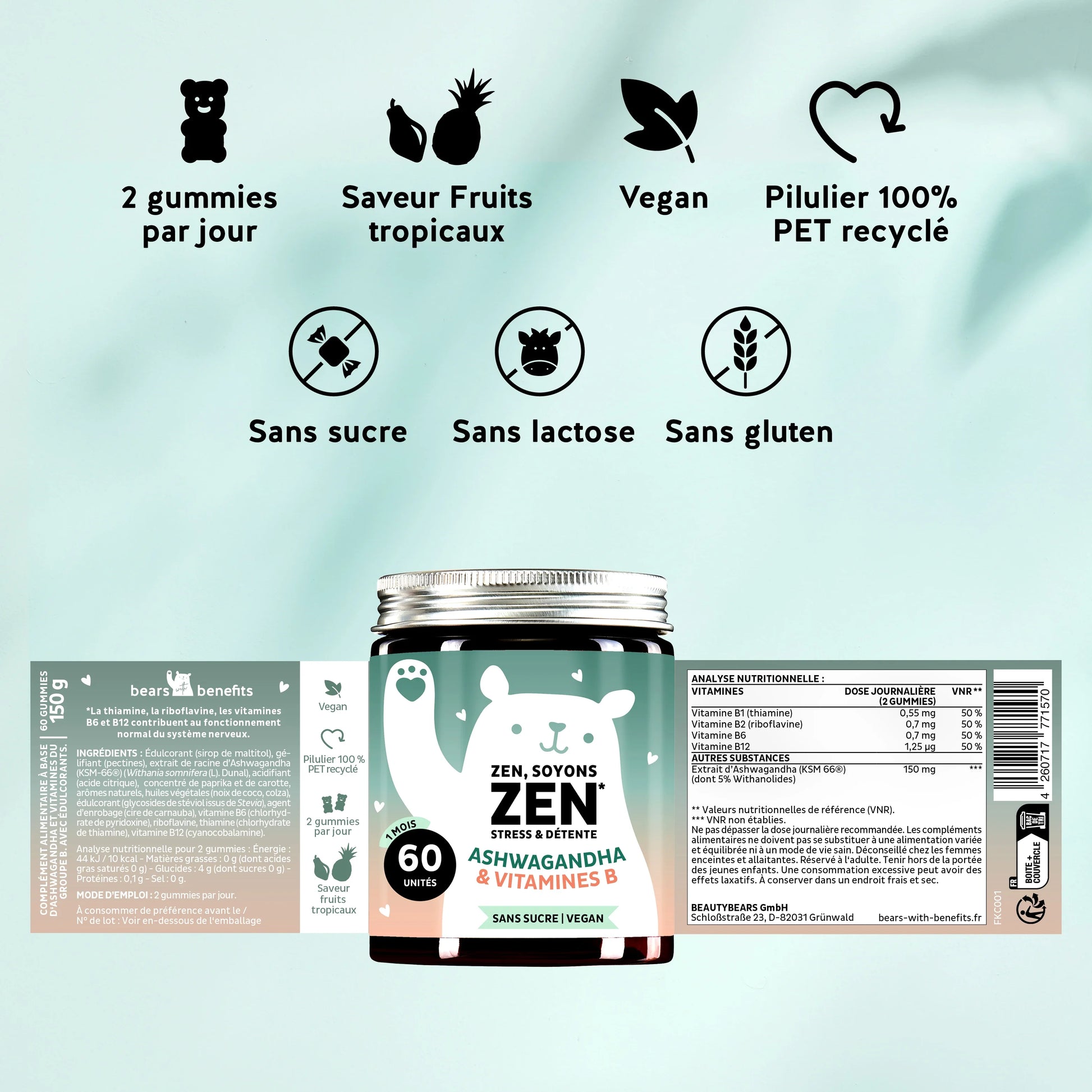 1. Zen, Soyons Zen Stress & Détente - avec ashwagandha Ces gummies associent l'ashwagandha bio (KSM-66®) à un complexe de vitamines B. L'ashwagandha, est une plante adaptogène utilisé en médecine ayurvédique, elle aide à gérer le stress et à améliorer l'équilibre émotionnel. Les vitamines B1, B2, B6 et B12 soutiennent le bon fonctionnement du système nerveux.