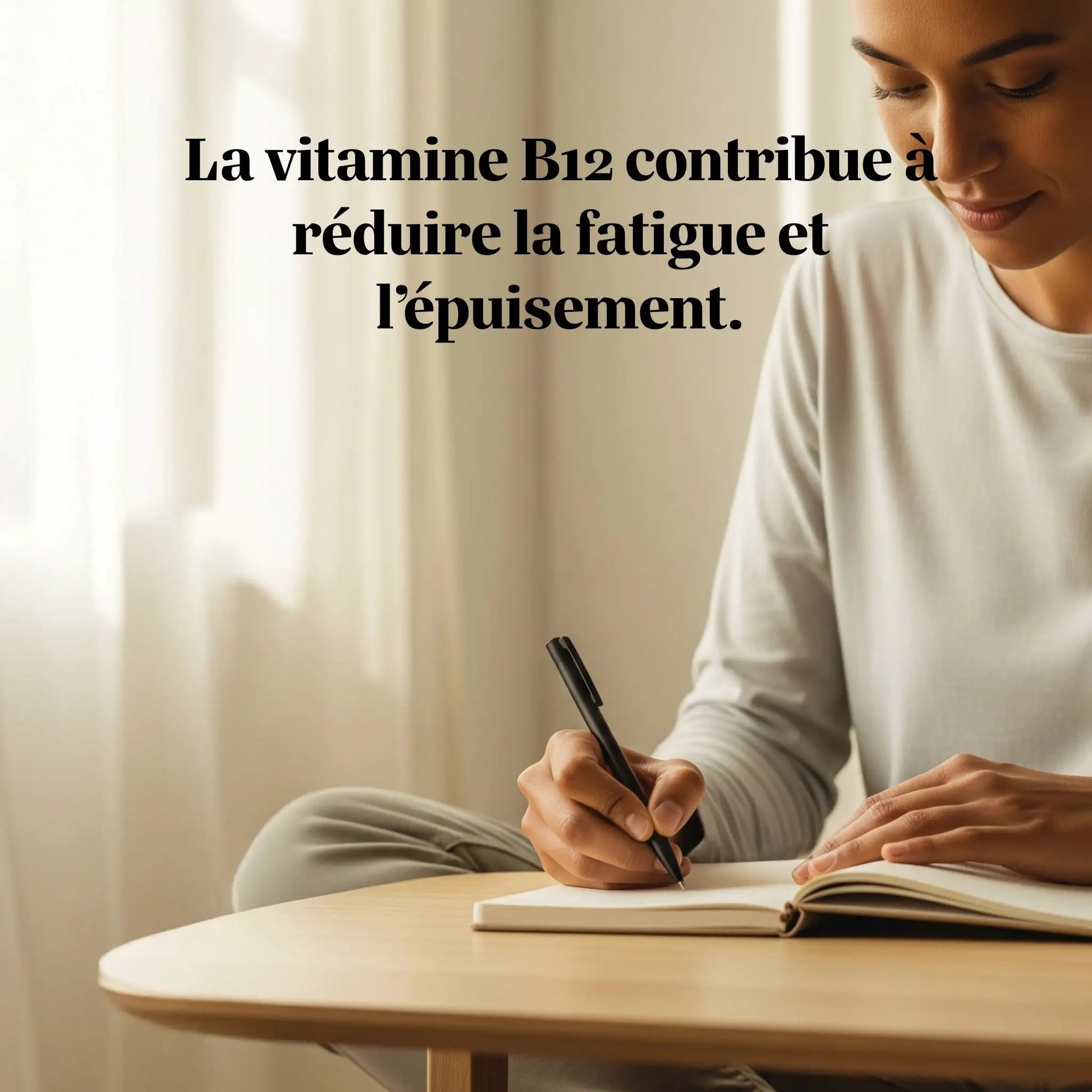 - La vitamine B12 contribue à un métabolisme énergétique normal, transformant les nutriments en énergie durable tout au long de la journée